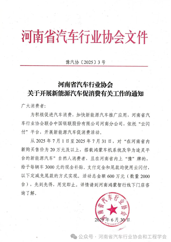从2025年7月1日至2025年7月31日,对“在河南省内新购买售价为20万元及以上,搭载鸿蒙车机系统及华为途灵平台的新能源汽车”自然人消费者,且在河南省内上“豫”牌的,给予每辆车3000元的现金补贴。